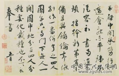 再来看看此帖,用笔可谓锋芒毕露,又不失变化之能事。此帖字与字之间上下连接,气贯前后,用笔粗细变化,细笔出虽有对比,却细得过分,对比太强烈,显得软弱了。蔡襄书法以新笔法入书为多,很少见到类似古篆隶的笔法在里面,所以苏东坡说他“分隶小劣”是没错的,从此帖便可窥探一二,古法不通则用笔不沉厚,结字不古气,这无疑对蔡襄书法是一个很大的限制。今人注重诗书画印等各项精能,清代诸家,不乏人才,近代吴昌硕、黄宾虹、齐白石后少见有能者,后人学全能不是吸收营养,皆以名利为之,确实荒谬不堪,让人可笑了。从这方面看,蔡襄给后人起到很大的启示作用,能通各样,将所需的营养据为己有,这是最好的修炼方法。再看此帖章法,平铺直叙,因是信札之故,无过多的编排上的讲究,只要方便阅读便是,孙过庭在《书谱》中讲到章法时说:“至如初学分布,但求平正;既知平正,务追险绝;既能险绝,复归平正。”此帖蔡襄章法上取势平正,不见一点险绝,此可见其难度之高,平正而不失气度,变化在平静中流露,恰如武林高手在无声处取人性命,是何等让人叹服!综合而言,蔡襄此帖用笔变化多端,结字平正,章法平实不奇,气质高雅,不足处是有些用笔过于柔弱,用笔不够浑厚,结字不入古法,略显平淡。