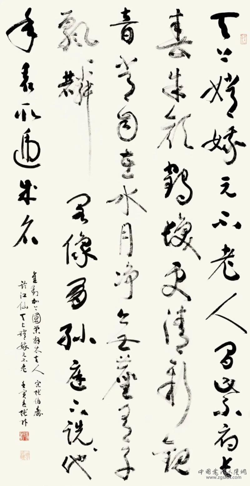 张戈的书法以动为形,以姿生神。虚实相生,形神兼备。尤其是其大草作品,笔资取意绵长,夸大线条的负荷力、张力,延长线条的伸缩度、曲度,追求“屋漏痕”之神髓,字形高古,姿态绰约,独步于当代书坛。如其草书横幅《王维诗》,字字飞动,顾盼生神,中轴摆动,字势奇崛,在连绵起伏的急速挥洒中强调笔断意连,在流畅的线性转换中,注重发力点的精准与存在。线条苍劲古拙,似老者倚松玩鹤,筋骨嶙峋,依然精神矍铄;又似鹤发顽童,点线面随心所欲,任其自然。气息流走于“S”形空间之上,在“一窝点”的烘托下,线条不断透明、清新、摇曳,意境悠远,呈现出骖鸾跨鹤、奋举云霄、飞逸奇浑的草书意境。