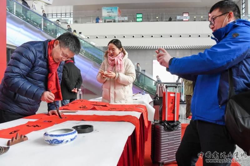 活动现场人山人海、墨香四溢,充满了浓浓的节日氛围。旅客们纷纷领取了自己满意的春联,带着吉祥的祝福满心欢喜地踏上返乡的路途。