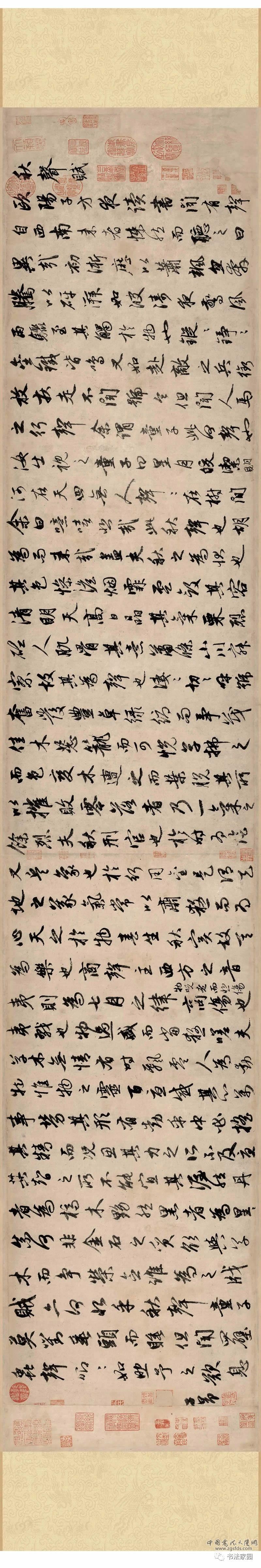元赵孟頫书《秋声赋》:行书,纸本,纵:34.8厘米,横:182.2厘米,辽宁省博物院藏 。总40行,共414字。为宋代著名文学家欧阳修所作的名赋,《秋声赋》哀而不伤,皆臻于儒家哲学和审美所追求的至高无上的境界。赵孟頫以行书书全文。行笔洒脱流畅,结体丰容缛婉,行间茂密,气韵汇通,得二王遗韵。