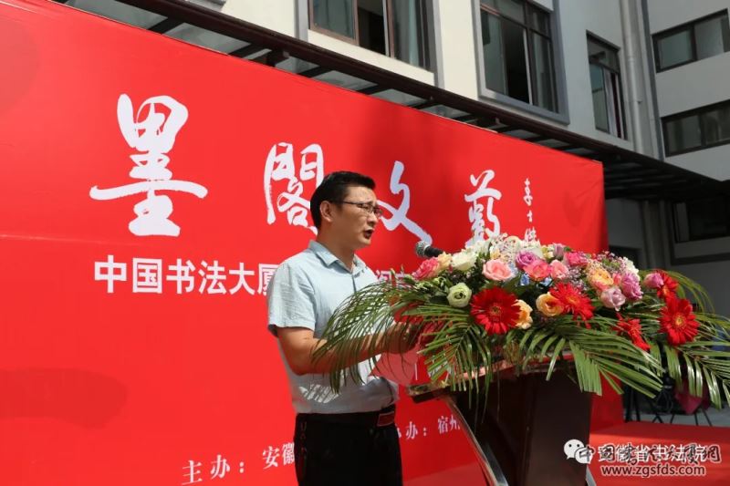宿州市文联党组书记、主席杜青在致辞中说道,宿州这片文化的土壤浸润着人民群众读书学习、痴迷翰墨的心田。中国书法大厦、安徽省书法院,几年来砥砺前行。在全国、全省文化界、书法界赢得一片赞誉。双墨阁建立在宿州市,不仅是服务宿州市书法家作品展示的平台,同时也是他们切磋交流技艺的场所,对于推动激励宿州市书法事业发展将会发挥积极的作用。