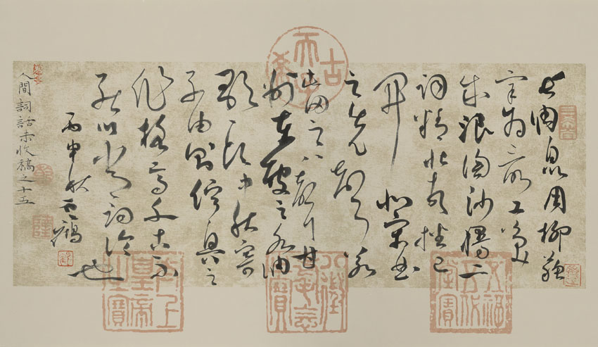 此外,还想补充一点就是草书创作与酒有着千丝万缕的联系,“颠张醉素”就是佐证。“张旭三杯草圣传,脱帽露顶王公前。天子呼来不上船,自称臣是酒中仙”。“ 醉来信手两三行,醒后却书书不得”。“ 狂来轻世界,醉里得真如”。 “吾师醉后倚绳床,须臾扫尽数千张。湖南七郡凡几家,家家屏障书题遍”。这都是酒的作用,酒使“颠张醉素”们放浪形骸,解衣槃礴;酒使他们物我两忘,进入化境;酒将他们的草书艺术发挥到极至,而炉火纯青。张旭、怀素的一生都没离开过酒,酒是他们栖息于草书创作的精神家园;酒是他们草书创作的催化剂。笔者也赞同草书创作者可适当饮一点酒,以微醺为佳,大醉者非挺天纵之才不可为。酒与草书结缘,酒因草书而生色,草书因酒而精彩。